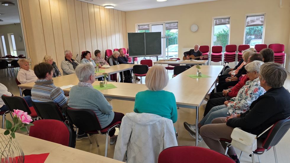Nach einer kurzen Einführung durch Frau Below, Vorsitzende des Förder- und Heimatvereins, unter dessen Schirmherrschaft die Veranstaltung stattfand, eröffnete Ulrich Kriehn die Lesung musikalisch. Gemeinsam mit dem Publikum wurde ein herbstliches Lied angestimmt – ein stimmungsvoller Auftakt, der in der Pause und zum Abschluss noch einmal wiederholt wurde.