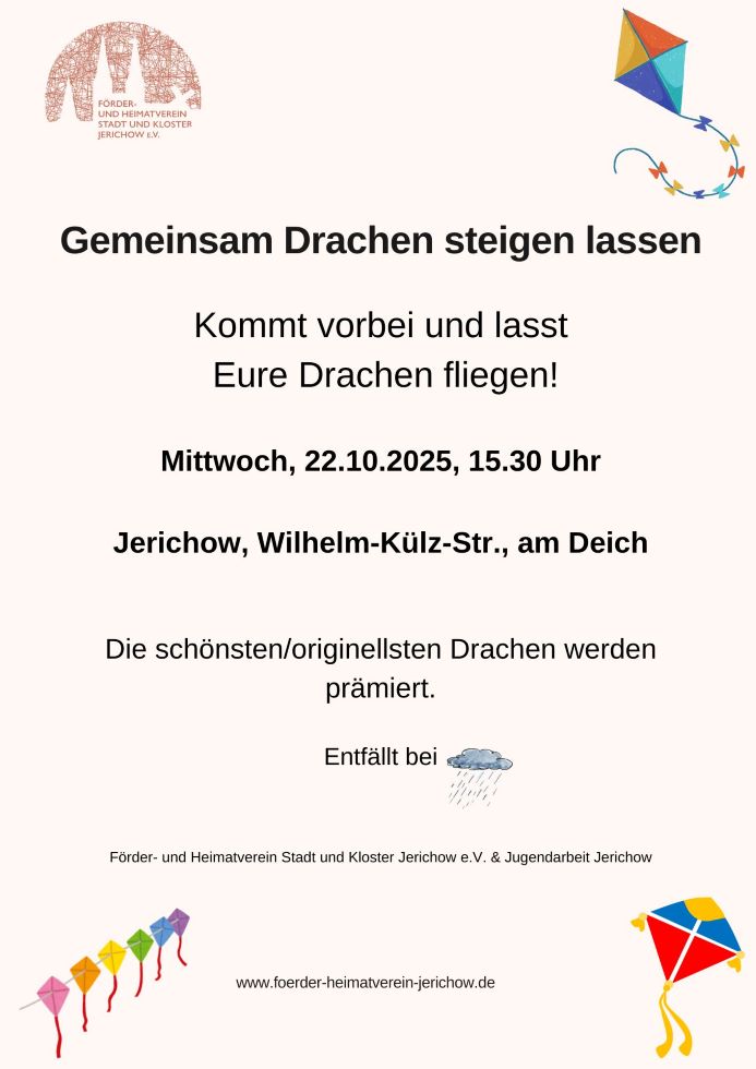 Das Drachensteigen findet am 22. Oktober 2025 um 15.30 Uhr in Jerichow, Wilhelm-Külz-Straße, am Deich statt.