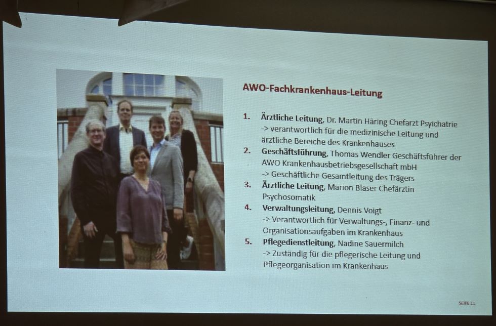 Im Rahmen der Veranstaltung stellte Wendler zudem die Leitung des Hauses vor und gab einen Überblick über die verschiedenen Fachbereiche. Die Fachabteilung für Psychiatrie bildet weiterhin einen zentralen Schwerpunkt. Ergänzt wird das Angebot durch differenzierte Behandlungsangebote im Bereich der Psychosomatik sowie durch einen ambulanten psychiatrischen Pflegedienst, der Patientinnen und Patienten auch außerhalb des stationären Rahmens begleitet.